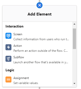 • Screen: Present screens to users to collect or display information (available only in Screen Flows).